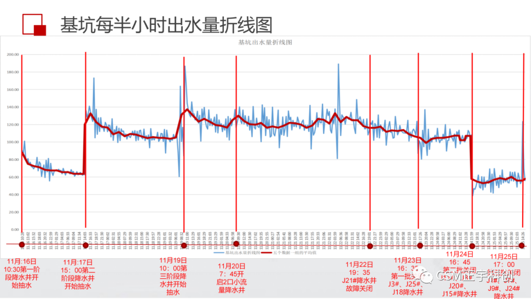 (1)基坑面积约25000㎡,通过降水井的开启,可将坑内水位稳定在绝对标高:0.5~1.9m,坑内总抽水量241.9m³/h,相当于4口60立方米的水泵出水量;