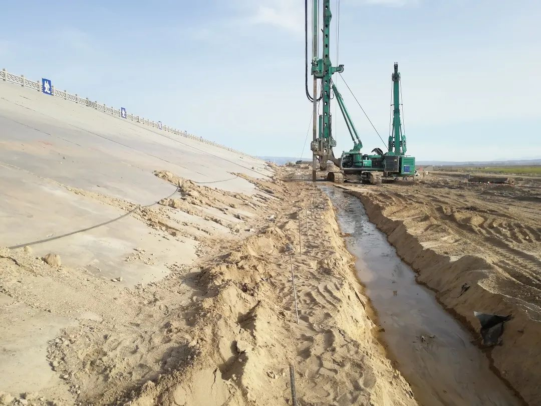 针对平原地区的江河、湖泊、水库等围堰防渗加固施工的方法和设备有很多,常用的有以下几种:一是采用液压地连墙抓斗成槽后浇筑混凝土防渗加固;二是采用高压旋喷加固并附加聚乙烯土工膜防渗;三是采用CSM深层搅拌工法通过一定参量的混凝土与坝基原土混合搅拌成墙,防渗加固一次完成;四是TRD工法,类似与CSM深层搅拌工法,也能做到防渗加固统筹完成。这几种工法各有千秋,选用何种工法和设备既要考量工程工况和地质条件对设备适用性要求,也要考虑施工的效率和经济性。下表是几种堤坝防渗加固常用工法和设备的比较: